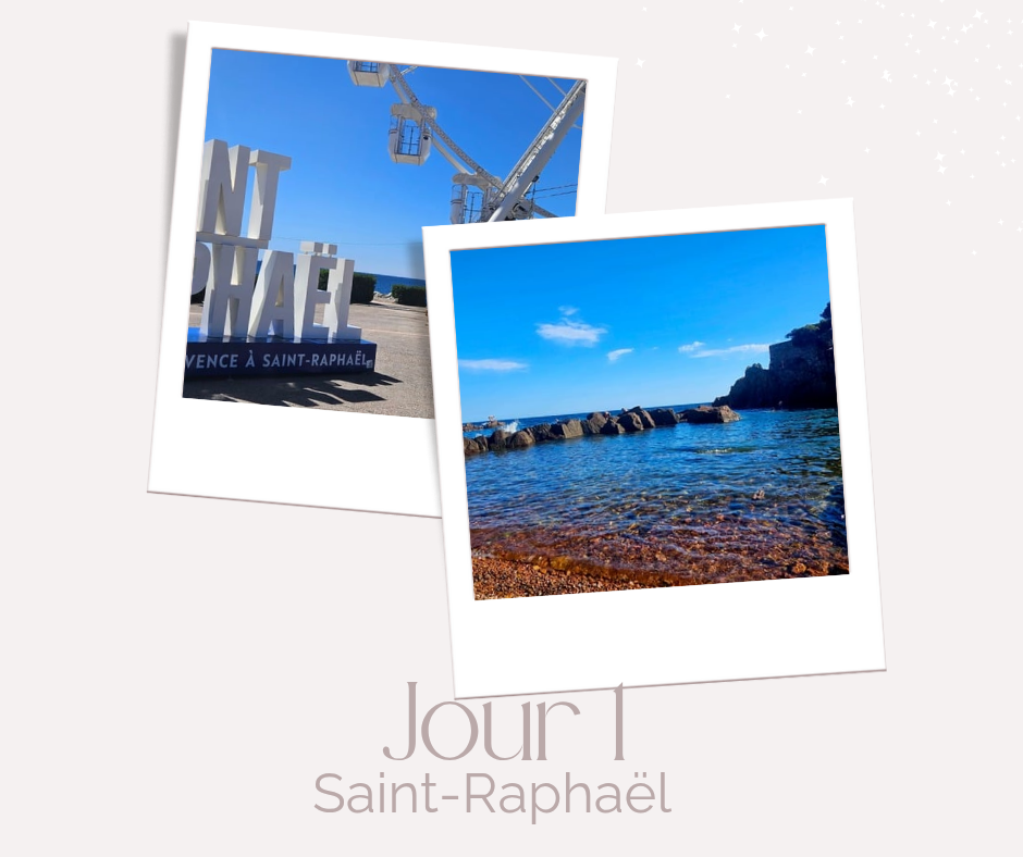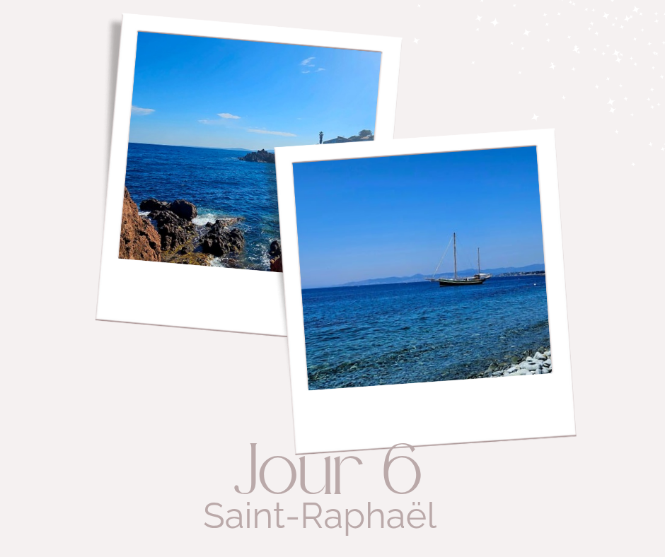 Nous sommes partis de Lyon vers 6h du matin en voiture pour éviter un maximum les bouchons des vacances d’été. Le trajet s’est bien passé. Nous sommes arrivés à Saint-Raphaël vers 11h30. En attendant l’heure du Airbnb, nous nous promenons dans la ville afin de trouver un petit restaurant pour manger. Après notre repas, rendez-vous à l’appartement pour récupérer nos clés. En fin d’après-midi, sur conseil de notre hôte, nous sommes allés nous baigner sur la Plage du Fournas. Située dans un petit passage entre des maisons, cette crique offre un magnifique contraste entre les couleurs de l’eau, du ciel et des rochers rouges. C’est un lieu idéal pour se détendre. Si vous décidez de vous y rendre, pensez à prendre des chaussures de bain pour vous baigner. Au milieu de ces rochers rouges, vous pouvez trouver un chemin de randonnée. Parfait pour prendre du recul et avoir une autre perspective de cette plage. Étant en tongs, nous ne sommes pas allés très loin ce jour-là.