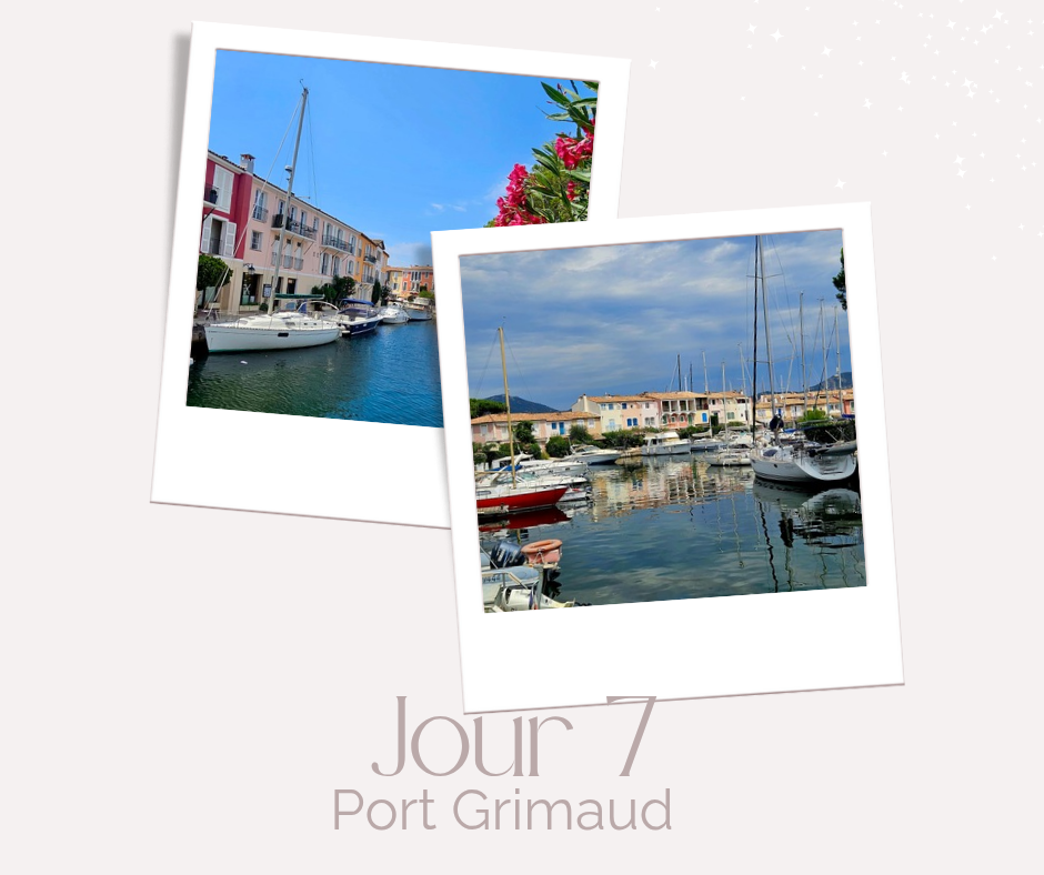 Voilà notre dernier jour ! Nous avons décidé de nous rendre à Port Grimaud après avoir rendu l’appartement. Un village unique surnommé la « Venise provençale », construit sur l’eau autour de canaux navigables. À notre arrivée, nous nous sommes dirigés vers la Place du marché où se trouvent des restaurants typiques pour notre déjeuner. Après, nous nous sommes baladés tout en découvrant les maisons colorées et les ponts qui relient les canaux tout en mangeant une glace. Vous pouvez louer un petit bateau électrique sans permis, un paddle ou un kayak pour naviguer sur les canaux.